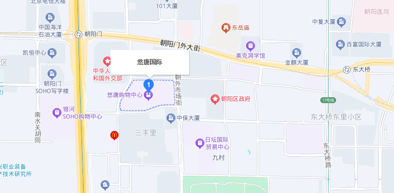 项目地处北京传统朝阳门商圈核心,北京东二环朝阳门桥东南外交部、司法部的东侧,悠唐国际中心是悠唐综合体当中 写字楼部分,位于悠唐综合体的东南角,东侧紧邻朝外市场街,向北直行可至工体北路,并快速抵达北京知名的休闲消 费娱乐中心三里屯酒吧一条街及工人体育场,方便您充分享受区域内丰富多彩的涉外生活氛围;南向直行可抵达北京室 内氧吧日坛公园,以及北京的第一使馆区;北侧朝阳门内外大街,快速抵达王府井商圈及国贸商圈,交通发达便利,连 接东西。东向与CBD核心区地标性建筑国贸三期、央视近在咫尺。项目除自身配套的五星级酒店及商场、公寓外,丰联 广场、人寿大厦、昆泰国际等高端商务办公环布周边,朝外MEN雅宝商城、老番街、日坛国际贸易中心云集于此,商务 及商业氛围浓厚,投资、增值价值不言而喻,是目前北京成熟的商圈核心要地。