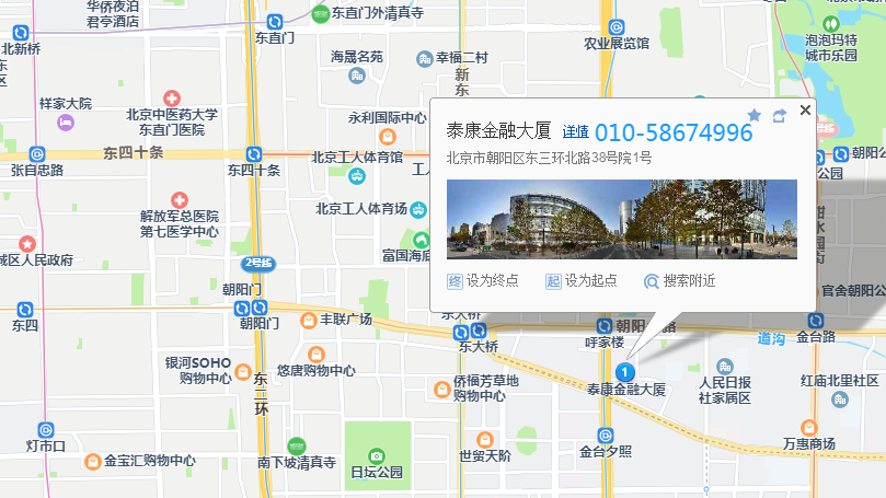泰康金融大厦,位于京广桥东北角,紧邻东三环,大厦高150米,地上38层,地下3层,恢宏的气度、卓越超凡的国际品质以及唯美典雅的艺术氛围,使其成为CBD又一道亮丽的风景。大厦内设艺术主题的高档商务会所,世界顶级红酒廊、高端餐厅、艺术活动空间、雪茄吧,中西合璧,独一无二。大厦周边商务氛围浓郁,中国大饭店、香港文华酒店、柏悦酒店、雅诗阁公寓、嘉里公寓、京广酒店、丽兹卡尔顿酒店、万豪酒店、国贸商城、世贸天阶。